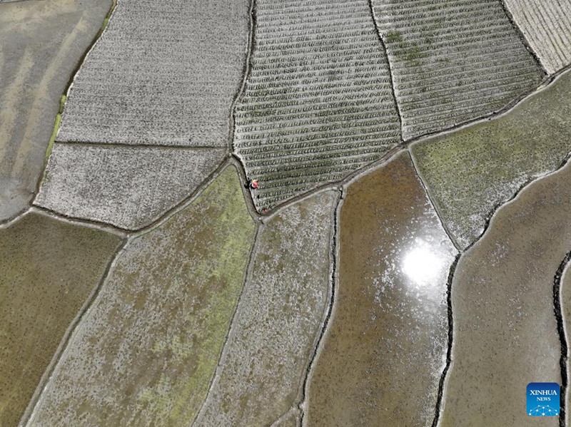 A foto aérea mostra um agricultor trabalhando no campo, distrito de Zizgui, cidade de Yichang, província de Hubei, centro do país, em 4 de maio de 2022. (Foto: Wang Huifu/Xinhua)