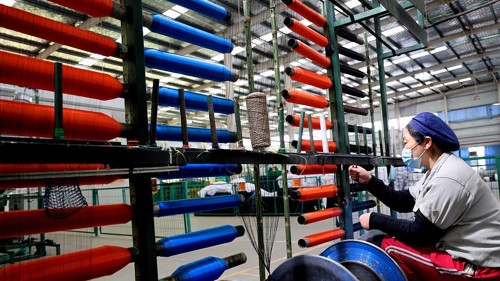 Uma funcionária na linha de produ??o de redes na província de Jiangsu, leste da China, em 6 de maio de 2022.