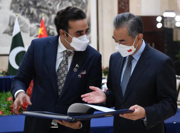 O conselheiro de Estado e ministro das Rela??es Exteriores da China, Wang Yi, conversou com o novo ministro das Rela??es Exteriores do Paquist?o, Bilawal Bhutto Zardari, no domingo em Guangzhou.