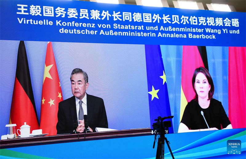 O conselheiro de Estado e ministro das Rela??es Exteriores chinês, Wang Yi, e a ministra das Rela??es Exteriores alem?, Annalena Baerbock, realizaram uma reuni?o virtual nesta ter?a-feira, trocando opini?es sobre a amplia??o dos la?os bilaterais e a defesa do verdadeiro multilateralismo, entre outras quest?es.