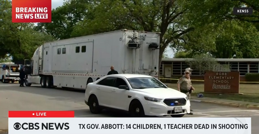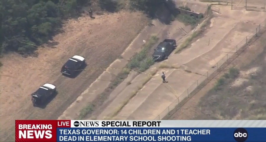 A captura da transmiss?o ao vivo da ABC mostra funcionários e veículos perto da Escola Robb Elementary em Uvalde, Texas, onde um atirador matou 18 crian?as e um professor em 24 de maio de 2022.