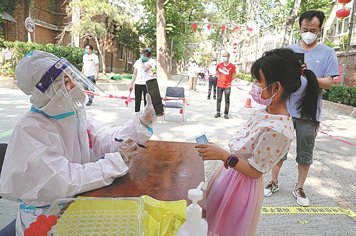 A voluntária de controle epidêmico Ren Ling registra informa??es de identidade de sua filha durante o teste de ácido nucleico para Covid-19 numa comunidade no distrito de Haidian, Beijing, em 24 de maio de 2022. [Foto: Cui Jun/China Daily]