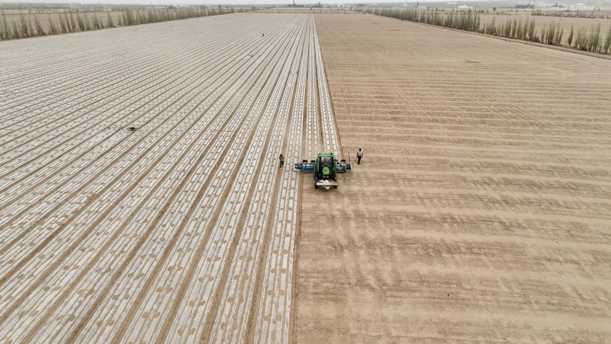 Campo de algod?o no condado de Bohu, Regi?o Aut?noma Uigur de Xinjiang. Produtores de algod?o usam máquinas com sistemas de posicionamento e navega??o por satélite Beidou para semear algod?o.