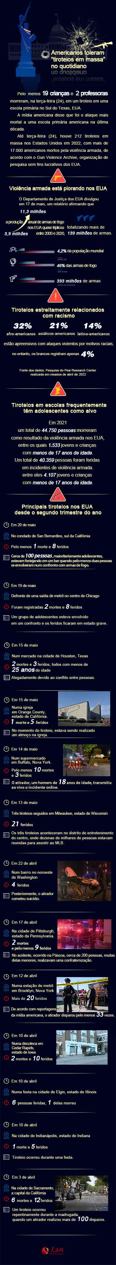 Até ter?a-feira (24), houve 212 tiroteios em massa nos Estados Unidos em 2022, com mais de 17.000 americanos mortos pela violência armada, de acordo com o Gun Violence Archive, organiza??o de pesquisa sem fins lucrativos dos EUA.