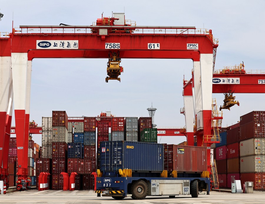 Um caminh?o transportando contêineres é visto na doca de contêineres do Porto de Yangshan, em Shanghai, no leste da China, em 27 de abril de 2022. (Foto: Chen Jianli/Xinhua)
