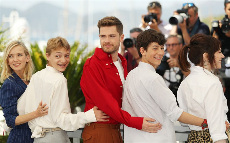 O diretor belga, Lukas Dhont (centro), e membros do elenco posam durante uma foto para o filme "Close" apresentado na Competi??o Oficial da 75a edi??o do Festival de Cinema de Cannes em Cannes, sul da Fran?a, no dia 27 de maio de 2022. (Xinhua/Gao Jing)