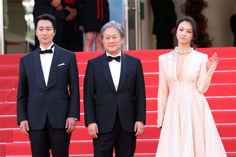 A atriz Tang Wei (1a, direita), o diretor, produtor e roteirista Park Chan-Wook (centro) e o ator Park Hae-Il chegam à exibi??o do filme "Decision to Leave (Heojil Kyolshim)" durante a 75a edi??o do Festival de Cinema de Cannes em Cannes, sul da Fran?a, no dia 23 de maio de 2022. (Xinhua)