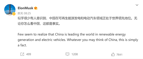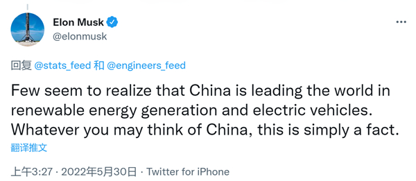 Nas horas seguintes, Musk postou a mesma declara??o em chinês no Sina Weibo, a mídia social chinesa equivalente ao Twitter. Anteriormente, Musk divulgou um ranking das 15 principais instala??es de energia eólica em todo o mundo, mostrando que a China liderou a lista com uma capacidade de 328.973 megawatts, seguida pelos Estados Unidos com 132.738.