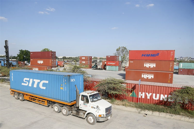 Caminh?o sai do Hong Leng Huor Dry Port, no subúrbio ocidental de Phnom Penh, Camboja, no dia 13 de janeiro de 2022. (Foto por Phearum/Xinhua)