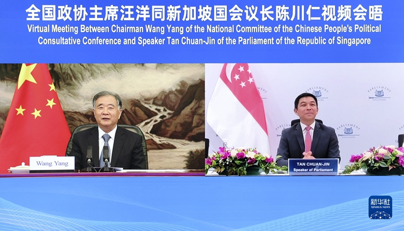 O mais alto conselheiro político da China, Wang Yang, e Tan Chuan-Jin, presidente do parlamento de Cingapura, realizaram na segunda-feira uma reuni?o virtual para discutir la?os bilaterais.