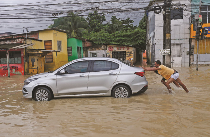 Pessoas empurram um carro ao longo de uma rua inundada em Recife, Brasil, na sexta-feira após chuva forte. (Foto: Lúcio Tavora/Xinhua)