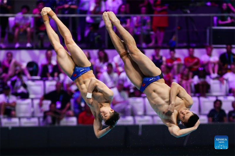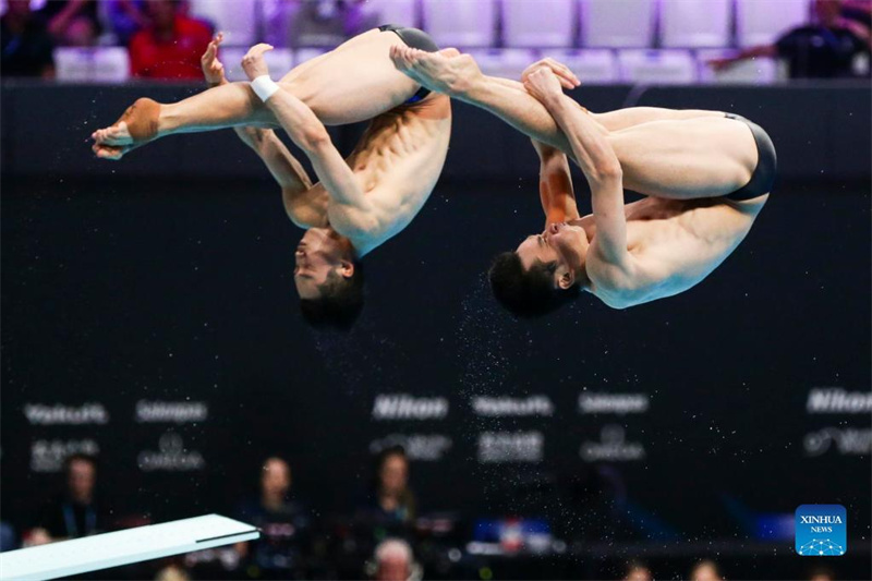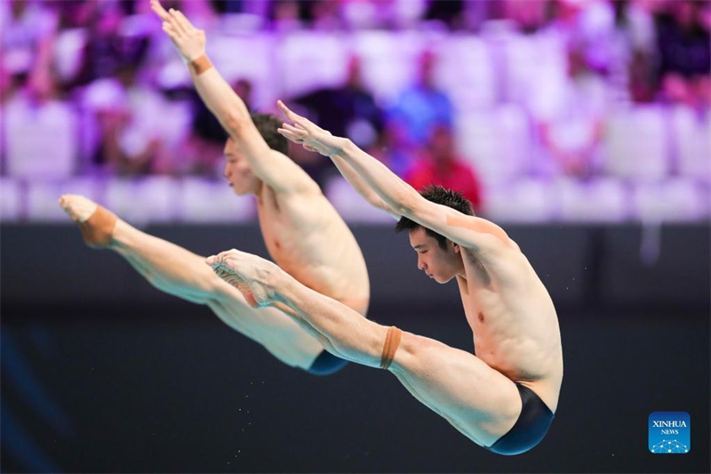 Cao Yuan (D) e Wang Zongyuan da China competem durante a final sincronizada masculina de 3m de mergulho no 19o Campeonato Mundial da FINA em Budapeste, Hungria, em 26 de junho de 2022. (Foto: Zheng Huansong/Xinhua)