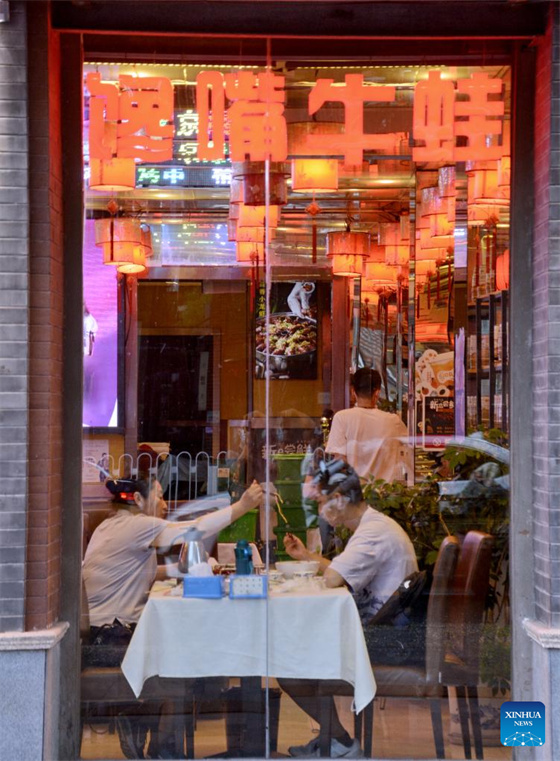 Casal em um restaurante de Guijie, uma animada rua de restaurantes gourmet em Beijing, capital da China, em 6 de julho de 2022. Foto: Li Xin, Xinhua
