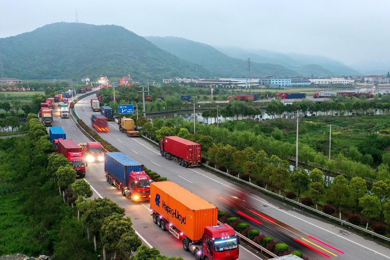 No início da manh? de 27 de abril de 2022, caminh?es de contêineres entraram e saíram do terminal de contêineres de Ningbo. Foto: Yao Feng, Diário do Povo Online