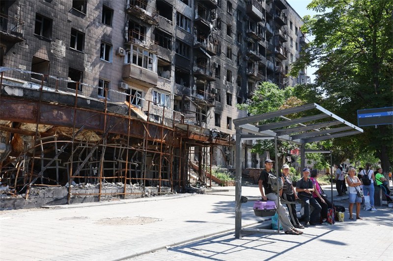 Moradores locais esperam o ?nibus perto de prédios da cidade danificados em Mariupol no dia 15 de julho de 2022.