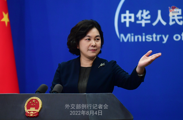 A China tem o direito de salvaguardar a sua soberania e a sua integridade territorial. A raz?o fundamental para a atual tens?o no Estreito de Taiwan é que o lado dos EUA, a despeito da forte oposi??o da China e de representa??es solenes, conspirou sobre a visita a Taiwan de seu terceiro representante mais alto em uma aeronave militar dos EUA, disse Hua. "Tal atitude prejudicou seriamente o princípio de Uma Só China e a soberania e integridade territorial da China".