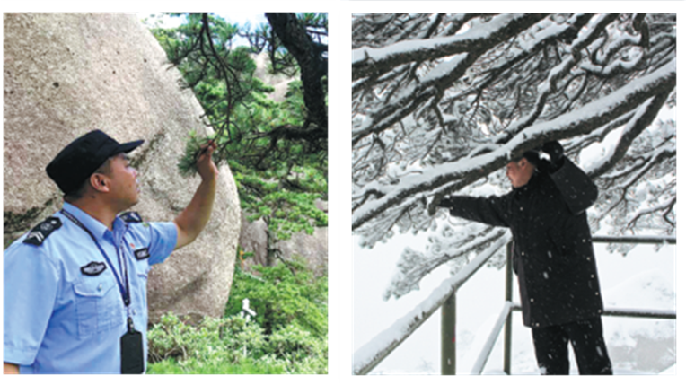Esquerda: Hu Xiaochun verifica a saúde de pinheiro durante uma patrulha na montanha Huangshan na província de Anhui. Direita: Hu cuida do pinheiro no inverno.