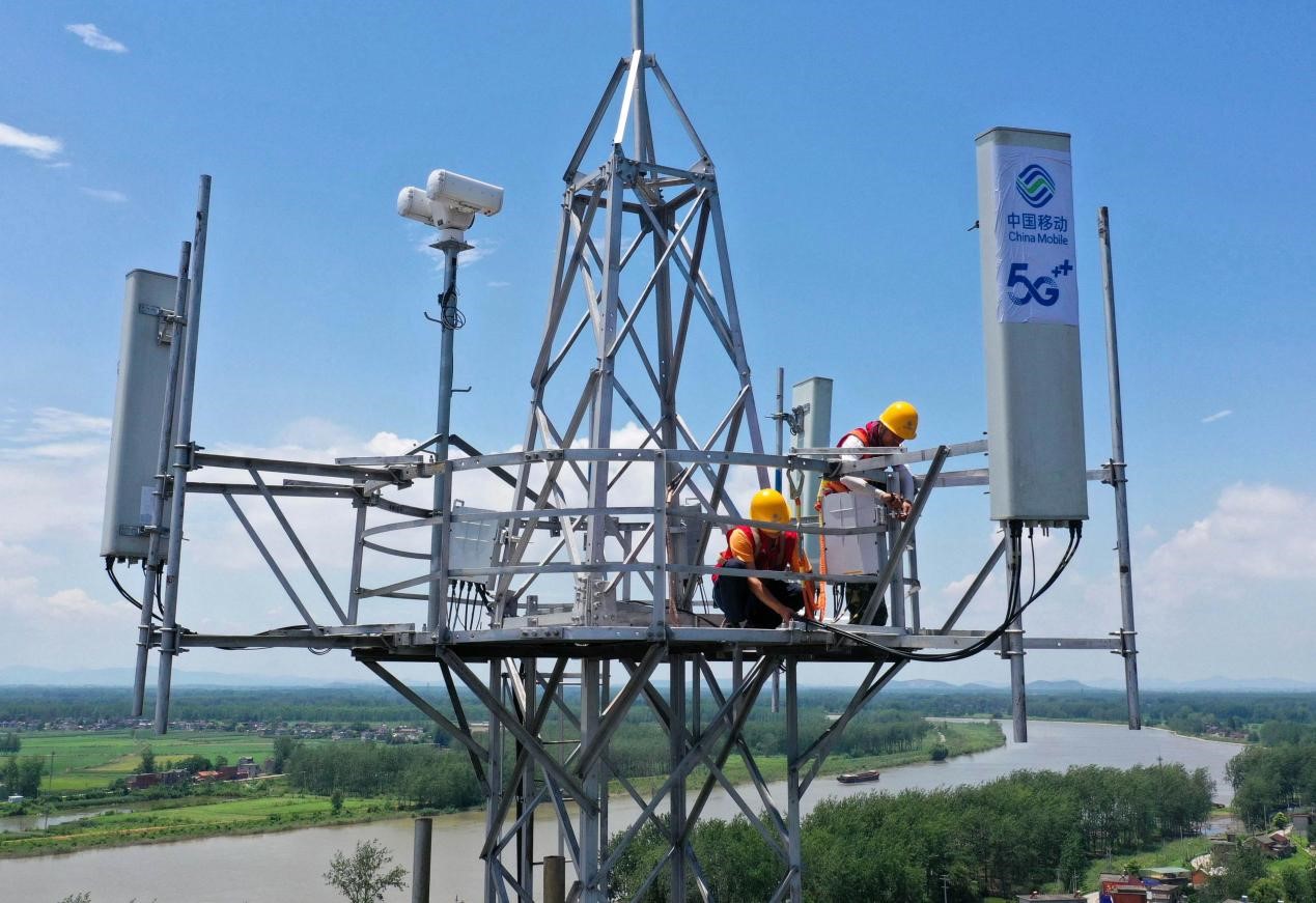 Trabalhadores ajustam a antena em uma esta??o base 5G na aldeia de Xuba, cidade de Tongling, província de Anhui, no leste da China, em 8 de julho de 2022. (Foto: Guo Shining/Diário do Povo Online)