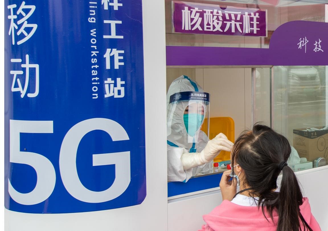 Uma funcionária de saúde coleta amostra de uma menina em um posto de teste de ácido nucleico na aldeia de Jiangdong, Jinhua, província de Zhejiang, leste da China, em 16 de maio de 2022. A aplica??o de uma rede 5G de alta velocidade permitiu que o local de teste tivesse informa??es dos moradores inseridas automaticamente no sistema do computador, digitalizando seus códigos de saúde. Todo o processo de amostragem para cada pessoa pode ser concluído em menos de 20 segundos. (Foto: Yang Meiqing/Diário do Povo Online)