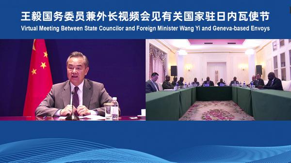 O conselheiro de Estado e ministro das Rela??es Exteriores da China, Wang Yi, se reuniu na segunda-feira por meio de videoconferência com enviados diplomáticos visitantes provenientes de países em desenvolvimento da ásia e áfrica do Escritório da ONU em Genebra.