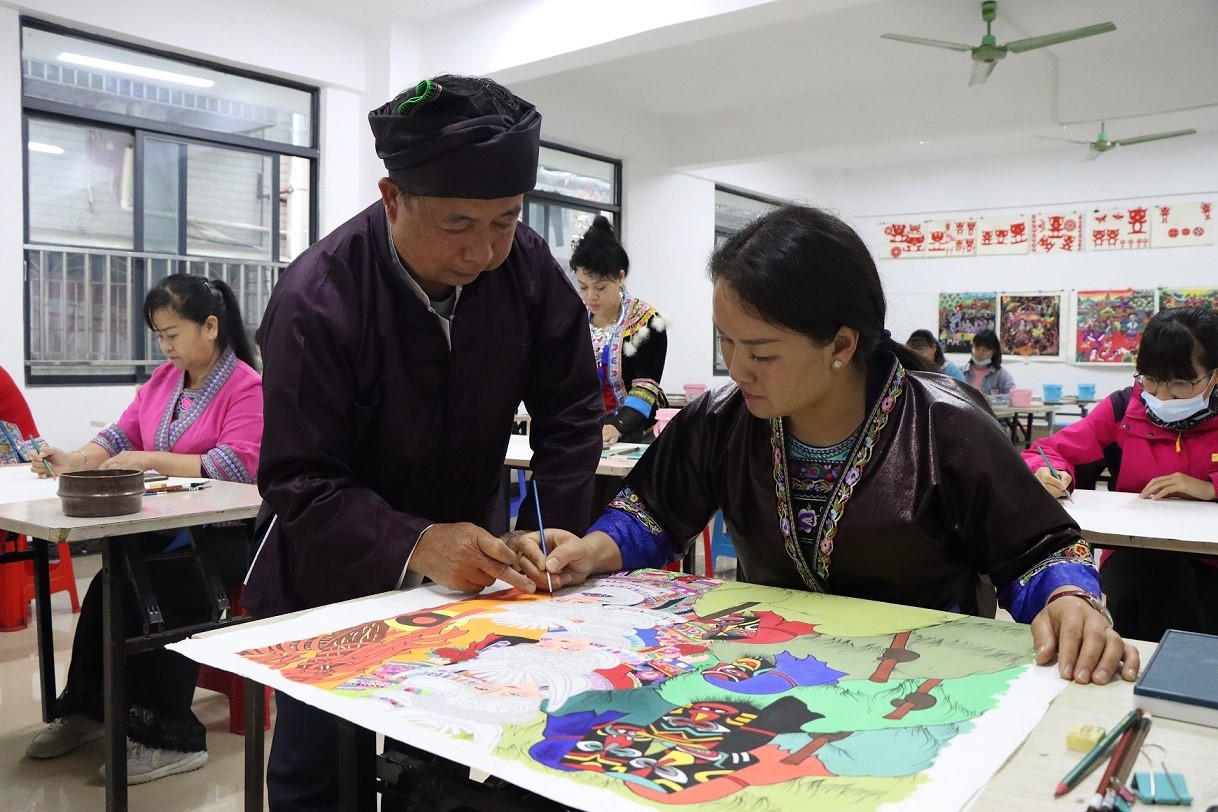 Miao Jialin, especialista em pintura de camponeses, instruindo uma aluna em maio de 2022, na cidade de Liuzhou, Regi?o Aut?noma da Etnia Zhuang de Guangxi. Foto de Liao Ziyuan/Diário do Povo Online