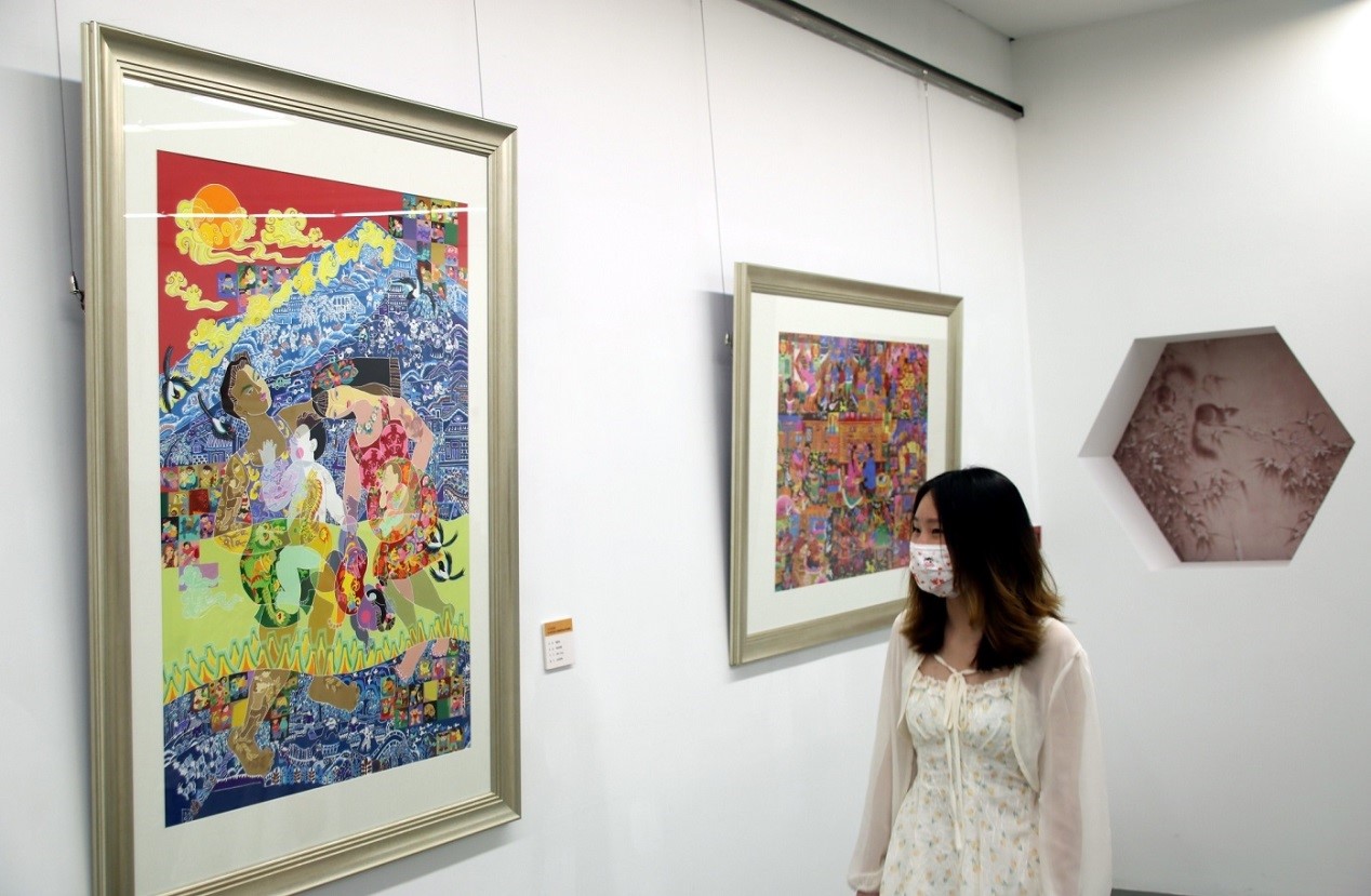 Visitante na mostra itinerante “Grande Beleza da Arte Folclórica - Bienal de Pinturas de Camponeses da China (Nanjing)” em agosto de 2022. Foto de Wang Jiankang/Diário do Povo Online