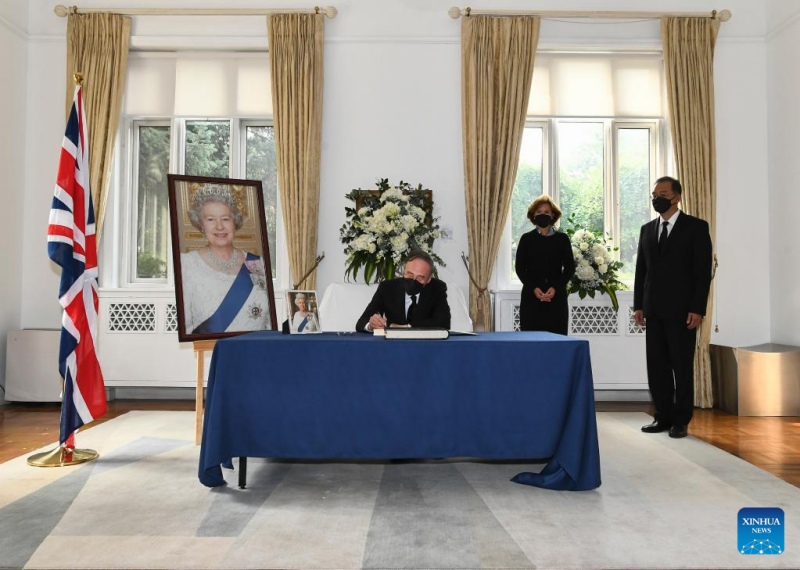 Wang ficou em homenagem silenciosa em frente a um retrato da rainha Elizabeth II e assinou o livro de condolências. Em nome do presidente Xi Jinping e do governo e do povo chinês, Wang expressou profundas condolências pela morte da rainha e estendeu a sincera simpatia à família real, ao governo e ao povo britanicos.