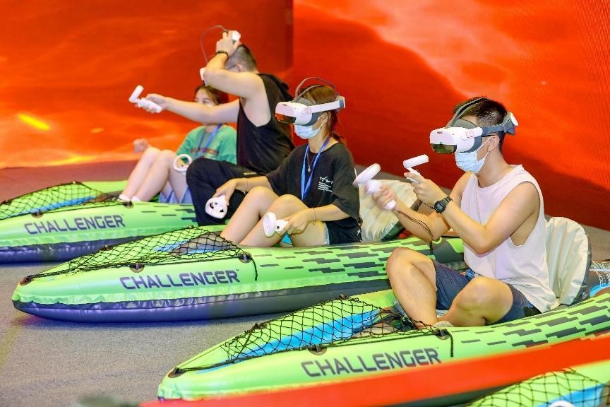 Visitantes experimentam remo virtual no pavilh?o interativo de e-sports digitais do Teatro Cangshan na cidade de Fuzhou, província de Fujian, em 18 de julho de 2022. Foto de Xie Guiming/Diário do Povo Online