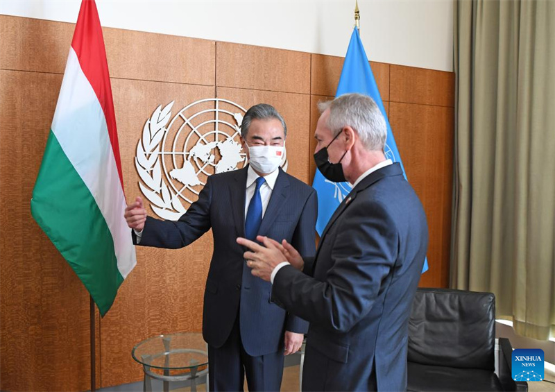 O conselheiro de Estado chinês e ministro das Rela??es Exteriores Wang Yi (E) se reúne com Csaba Korosi, presidente da 77a sess?o da Assembleia Geral das Na??es Unidas (AGNU), à margem da 77a sess?o da AGNU em Nova York, em 24 de setembro de 2022 . (Foto: Li Rui/Xinhua)