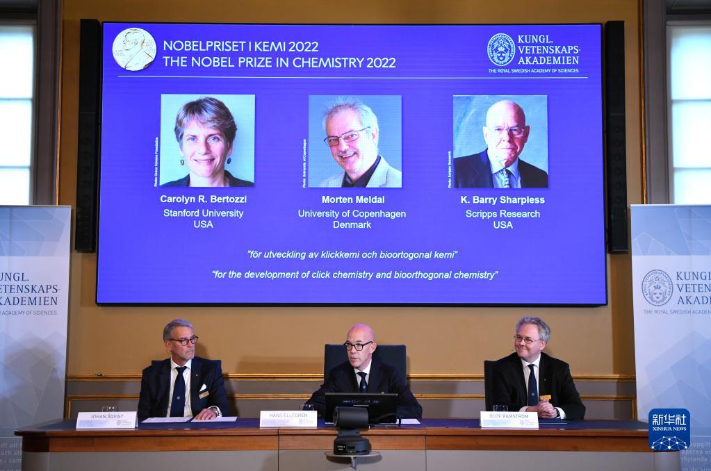 Carolyn R. Bertozzi e K. Barry Sharpless, dos Estados Unidos, e Morten Meldal, da Dinamarca, compartilharam o Prêmio Nobel de Química de 2022 "pelo desenvolvimento da química do clique e química bioortogonal", anunciou a Academia Real das Ciências da Suécia na quarta-feira.