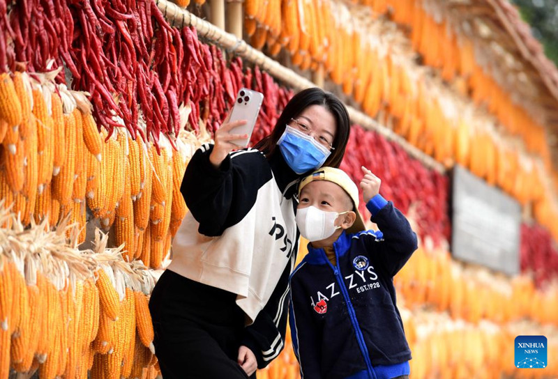 Turistas posam com milho na vila de Duanzhuang, em Shijiazhuang, capital da província de Hebei, norte da China, em 5 de outubro.