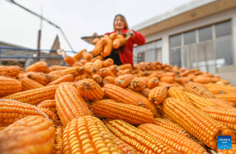 Um alde?o seca o milho na vila de Nianyuchi, em Zunhua, na província de Hebei, norte da China, em 5 de outubro.