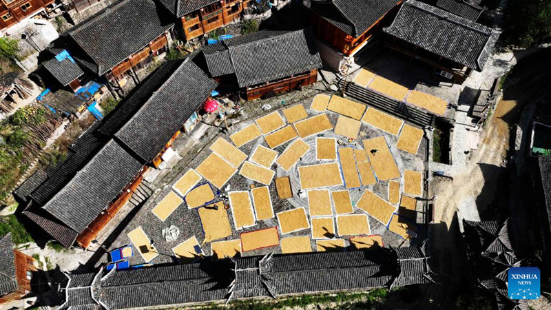 A foto aérea capturada em 5 de outubro mostra um alde?o secando o arroz na vila de Hongyang, condado de Taijiang, na província de Guizhou, sudoeste da China, em 5 de outubro.