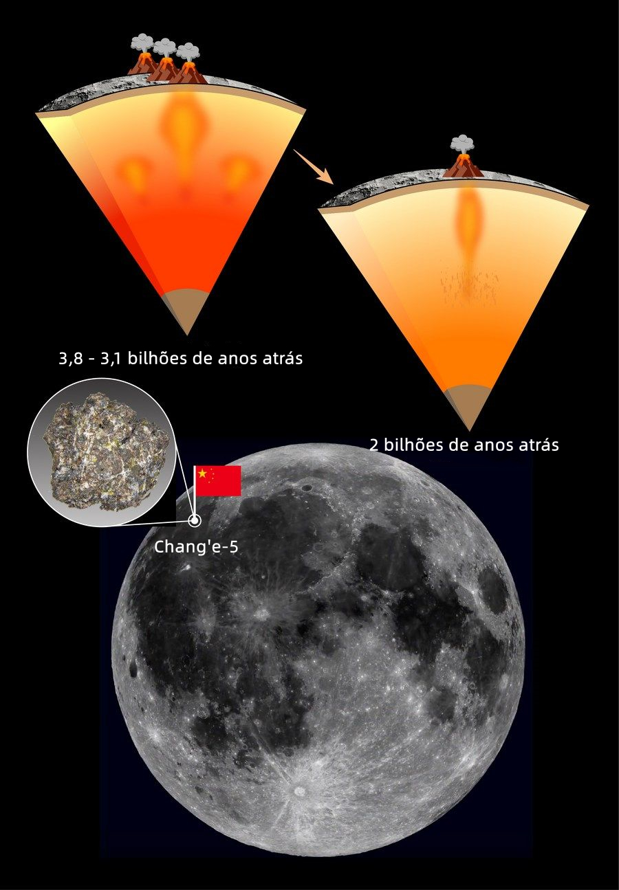 A sonda chinesa Chang'e-5 revelou uma atividade vulcanica surpreendentemente jovem, com apenas 2 bilh?es de anos, descartando a teoria de que a Lua está geologicamente morta após a forma??o de amostras da Apollo, há pelo menos 3 bilh?es de anos.