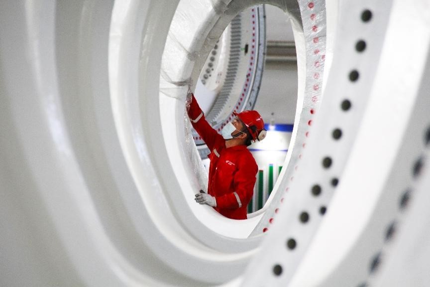Trabalhadores ocupados na oficina de montagem final da Jinfeng Wind Power em Hami, Xinjiang, China, em 16 de julho de 2022. Fotos: Xu Xinghan, Diário do Povo Online
