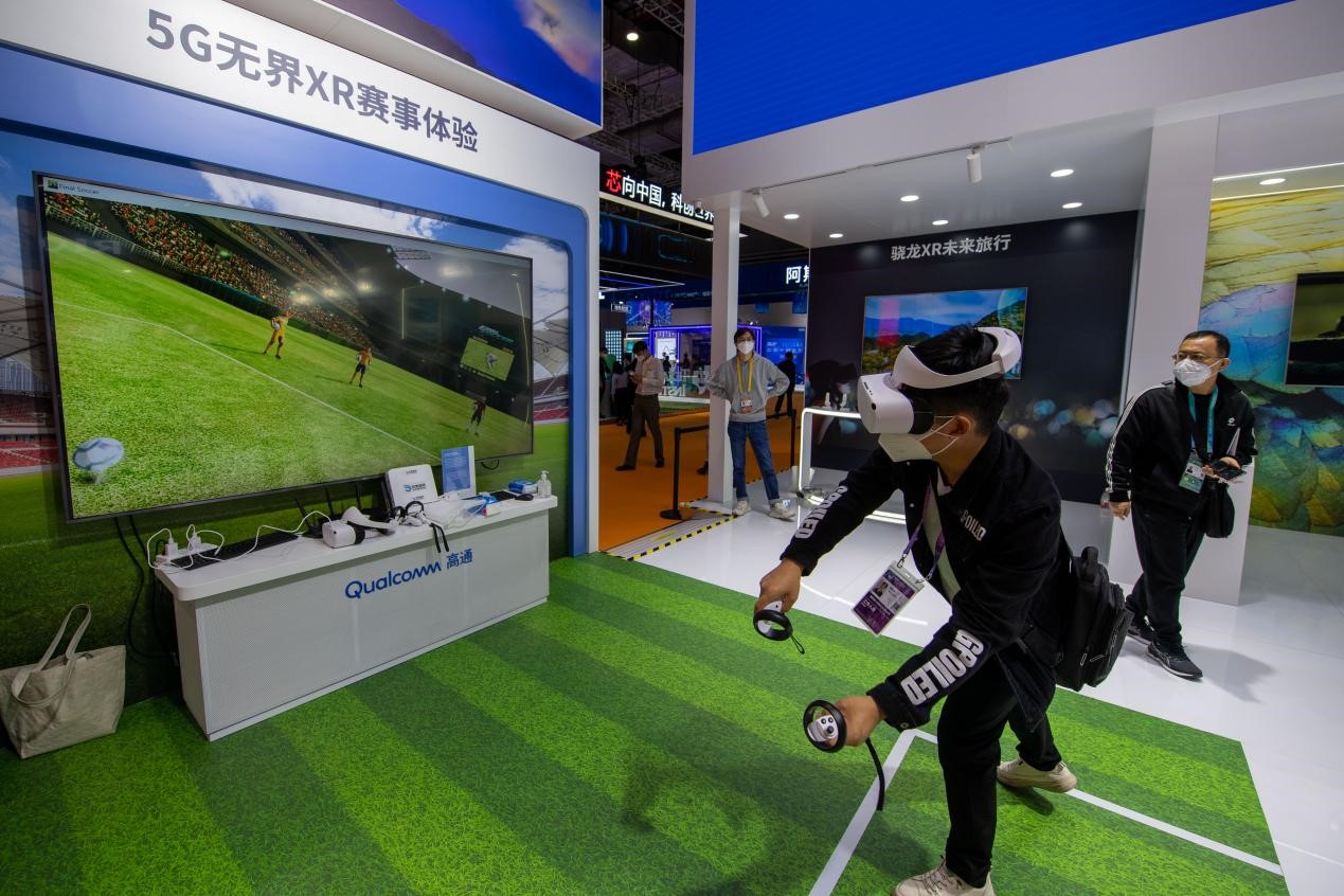 Estande da Qualcomm na área de exposi??o de equipamentos técnicos da quinta CIIE. Visitantes experimentaram a divers?o do futebol de forma imersiva por meio da tecnologia XR. Foto: Weng Qiyu, Diário do Povo Online