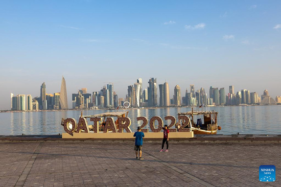 Pessoas tiram fotos com uma instala??o da Copa do Mundo da FIFA 2022 perto de Doha Corniche em Doha, Catar, em 11 de novembro de 2022. (Foto: Xinhua)