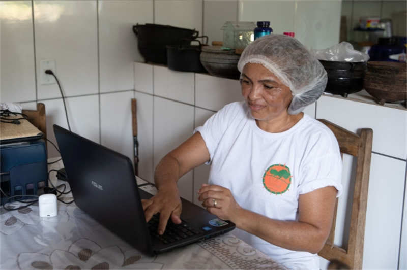 Marlene Araújo Dias, trabalhadora de uma fábrica de polpa de frutas, usa um computador recém-adquirido em casa, em 4 de outubro de 2022, na comunidade quilombola Malhadinha, Tocantins, Brasil. (Foto: Wang Tiancong/Xinhua)