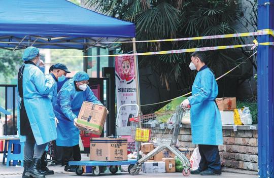 Trabalhadores comunitários preparam itens de necessidades diárias para residentes de uma área com alto risco de Covid em Chongqing na segunda-feira. A cidade identificou 178 casos locais de Covid e 6.157 portadores assintomáticos na segunda-feira.