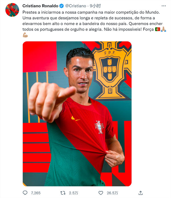 Cristiano Ronaldo publicou informa??es nas redes sociais na quinta-feira (24). Em véspera de se estrear na Copa do Mundo do Catar 2022, ele disse que queria encher todos os portugueses de orgulho e alegria.