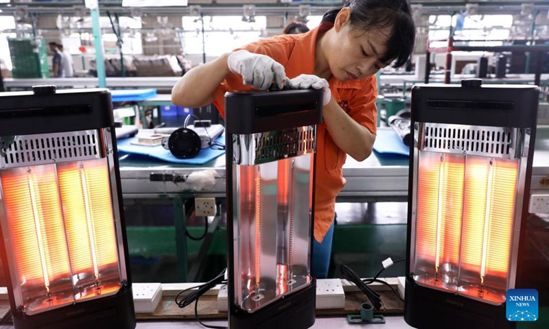 Uma funcionária verifica aquecedores elétricos numa empresa em Foshan, província de Guangdong, no sul da China, em 29 de setembro de 2022. De junho a agosto deste ano, Foshan viu a exporta??o de equipamentos de aquecimento para países da Uni?o Europeia no valor de 94 milh?es de yuans (cerca de 13,2 milh?es de dólares americanos), um aumento anual de 154,4% em rela??o ao ano anterior.