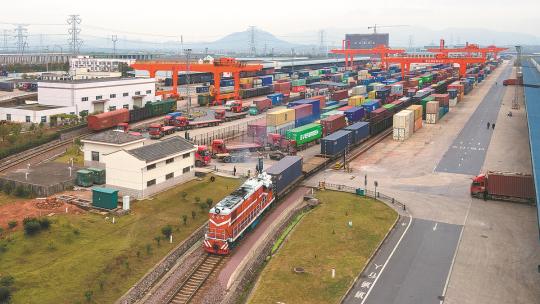 Um trem de carga em Jinhua, província de Zhejiang, parte para o Laos. (Foto: Hu Xiaofei/China Daily)