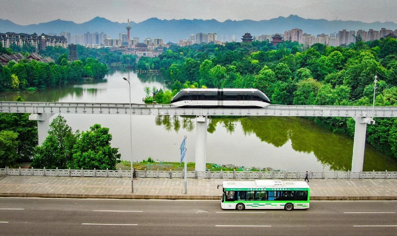 Monocarril de passageiros e ?nibus movido a novas energias circulam lado a lado em Bishan, Chongqing. Foto de Hu Yuejian/Diário do Povo Online