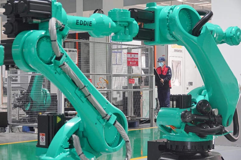 Trabalhadores operam máquinas-ferramentas inteligentes de fabrico de rob?s industriais na Shandong Yantai Aidi Precision Machinery Co., a 23 de novembro de 2022. Foto de Tang Ke/Diário do Povo Online