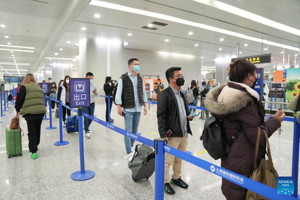 Passageiros fazem fila para passar pelos procedimentos de entrada no Aeroporto Internacional de Pudong em Shanghai, no leste da China, em Shanghai, em 8 de janeiro de 2023. [Foto: Xinhua]