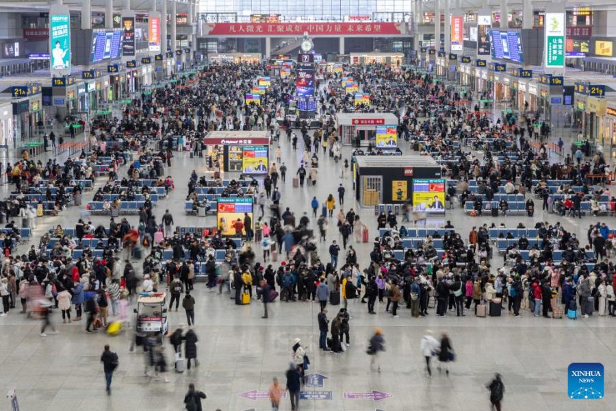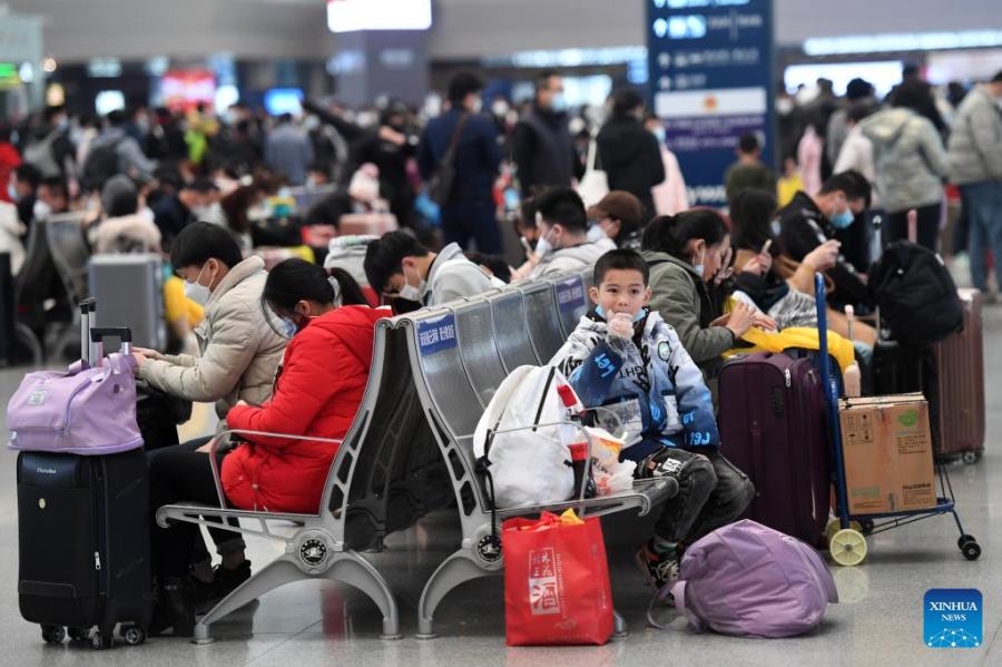 Passageiros aguardam na Esta??o Ferroviária Leste de Nanning, Regi?o Aut?noma da Etnia Zhuang de Guangxi, sul da China, em 27 de janeiro de 2023. (Xinhua/Lu Boan)