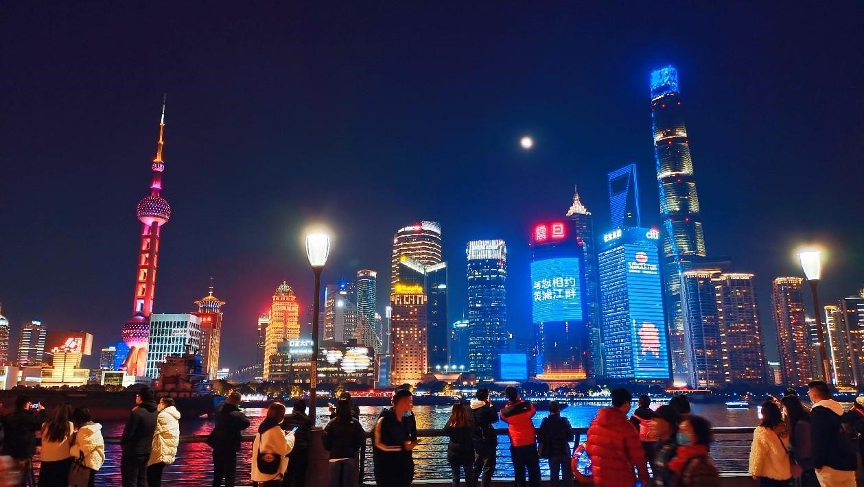 Foto tirada em 8 de janeiro de 2023 mostra o cenário noturno em Lujiazui, o distrito financeiro de Shanghai. Foto: Chen Yuyu, Diário do Povo Online