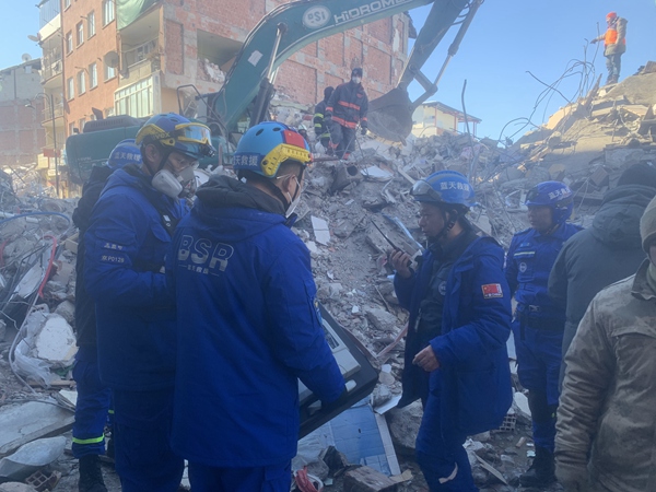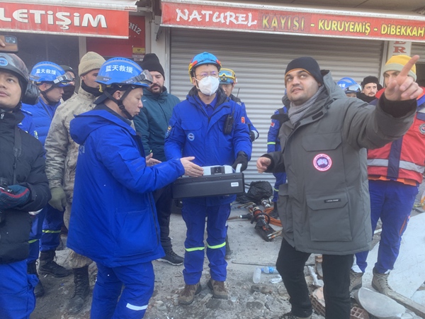 A equipe de resgate chinesa Blue Sky Rescue, incluindo três membros da Hainan Blue Sky Rescue, chegou ao Aeroporto de Malatya, Turquia, às 5h30 da quinta-feira (9) e iniciou imediatamente os trabalho de resgate em grupos.
