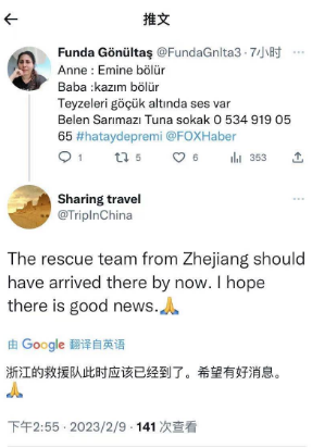 Felizmente, às 13h30, horário local, resgatamos em conjunto uma família com 2 adultos e 3 crian?as na cidade de Belen, juntamente com a equipe de buscas do exército turco. Dois adultos ficaram gravemente feridos e foram levados de urgência para o hospital para tratamento. Felizmente, nenhuma das crian?as ficou ferida.