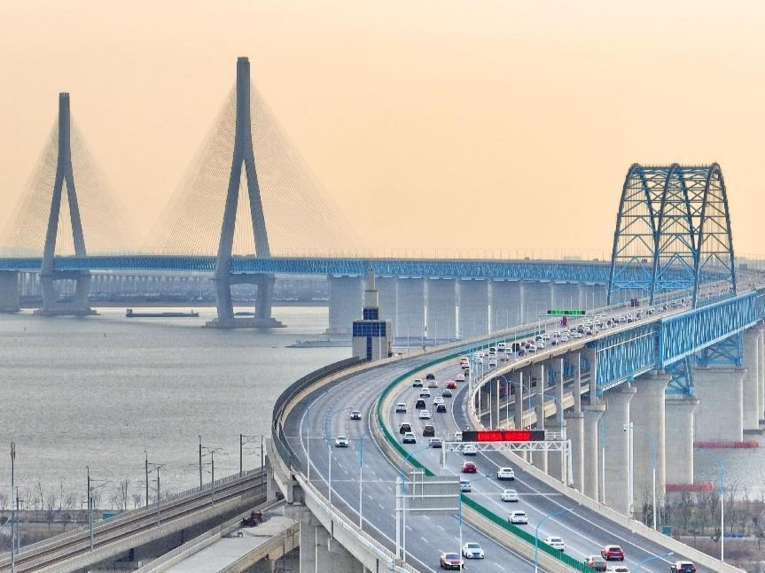 Foto mostra veículos passando por uma ponte em Nantong, província de Jiangsu, no leste da China, em 25 de janeiro de 2023. (Foto: Xu Congjun/Diário do Povo Online)